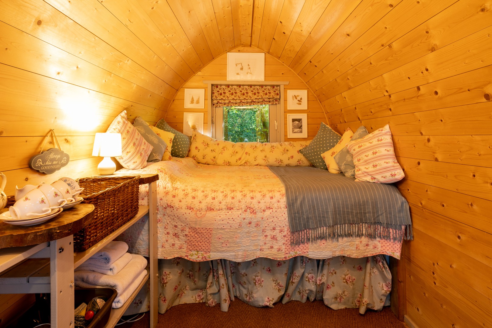 We have two cute vintage styled pods and 3 huge themed 6 meter Bell Tents all spaced throughout the woodland approximately 20 -30 meters away from each other so guests have their own private space, but close enough for groups to congregate and enjoy each others company. Daisy and Bluebelle Pods sit together in the main clearing around the brick built fire pit and under cover seating area. The Moroccan Bell tent sits in it’s own space to the side of the main clearing. The Bedouin Bell Tent sits also to the side of the main clearing, but in it’s own private area looking out into the woodland. The Jungle Bell Tent sits a little further into the woodland in it’s own sunny clearing looking out into the woodland. Surrounded by the beautiful countryside of the North Wessex Downs AONB each unit offers everything you need for a comfortable glamping stay, the pods sleeping two adults in a soft double bed and up to 2 children 12 and under on fold out z beds which just like camping lay on the floor. The tents sleep 2 adults again in a comfy double bed and up to 4 children 17 and under on fold out z beds. Whilst we offer everything you need for a comfortable self catering glamping stay including all cooking eating and washing up equipment, bedding towels tea coffee and sugar, so you do not need to bring any equipment yourselves, we stay true to the camping vibe by drawing our guests outside with our private outdoor seating areas, private outdoor under cover cooking areas including gas stove and charcoal BBQ, under cover seating areas, firepits and bathrooms with flushing loos and hot showers right next door. The children can even make their own z beds which lay on the floor just like camping! there’s just no need to bring any of the bedding as it’s all included! The pods have electricity so contain fridges kettles and toasters and are heated and the tents are completely off grid so contain a log burning stove, cool box and a communal fridge freezer. Everything on site is even drinking water so no need to bring that either! We also have an outside sink for washing up and filling your water bottles.