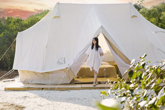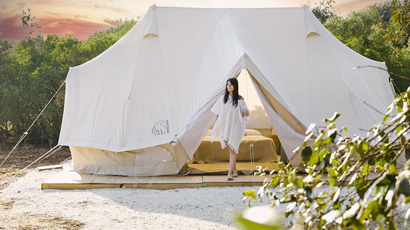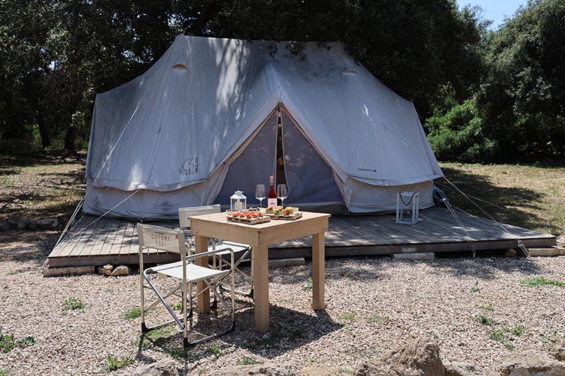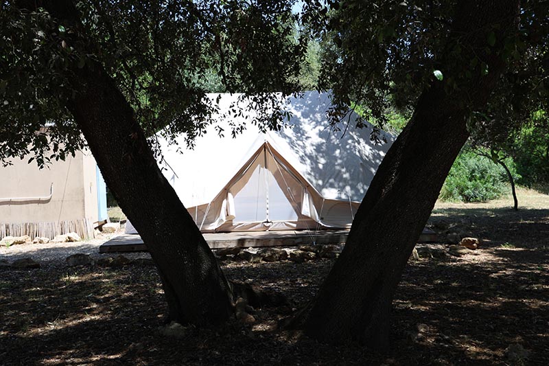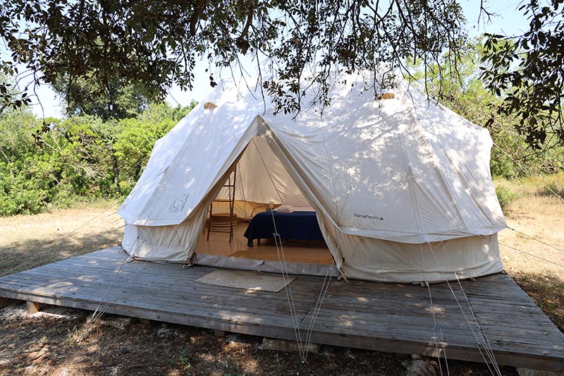 Unsere Zelte, die vollständig mit umweltfreundlichen Materialien ausgestattet sind, sind als offene Räume konzipiert, in denen Sie alle notwendigen Annehmlichkeiten für einen komfortablen Aufenthalt finden.