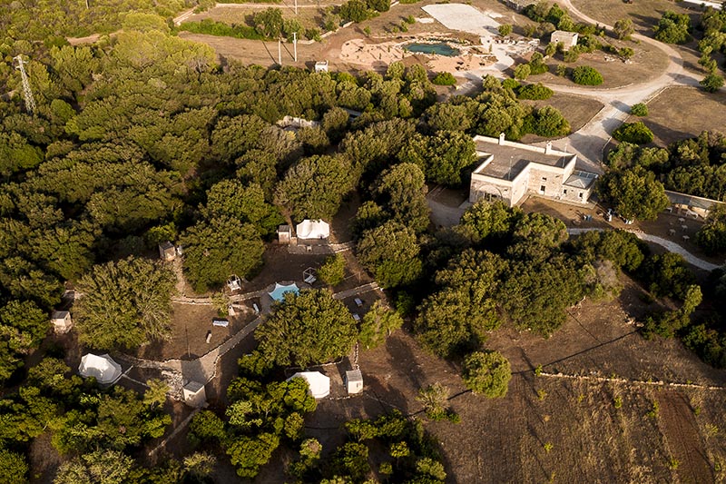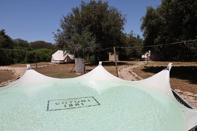 Der Stil und die Farben stehen im Einklang mit der gesamten Umgebung der Masseria, und im Schatten der majestätischen Bäume befinden sich ein gemeinsamer Pool und ein Solarium, damit Sie weder auf Sonnenbäder noch auf erfrischende Sprünge ins Wasser verzichten müssen.